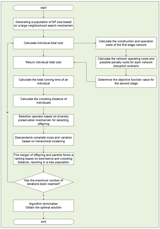 A significant contribution of our research is the development of a hybrid evolutionary algorithm featuring a dual-chromosome-encoding structure. This algorithm, which employs NPGA as its core framework, is enhanced by advanced Large Neighborhood Search mechanisms and hierarchical clustering-based crossover and mutation strategies. These enhancements significantly improve the algorithm’s search capabilities within the solution space, ensuring that the network’s symmetry is preserved even under varying conditions.