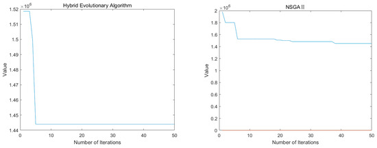 From Table 3, it can be observed that the hybrid evolutionary algorithm designed in this paper yielded two sets of Pareto solutions, corresponding to time-preferred and cost-preferred solutions, denoted as Pareto Solution 1 and Solution 2, respectively. NSGA-II ultimately obtained three sets of Pareto solutions, where Pareto Solution 1 and Solution 3 represent time-preferred and cost-preferred solutions, while Pareto Solution 2 serves as a compromise between Solutions 1 and 3. Analyzing the optimal objective function values reveals that the cost-preferred Pareto solutions of the hybrid evolutionary algorithm dominate NSGA-II’s Pareto Solution 1 and Pareto Solution 2, whereas the time-preferred Pareto solutions of the hybrid evolutionary algorithm dominate all three sets of NSGA-II’s Pareto solutions. This indicates that, regardless of decision makers’ cost or time preferences, the hybrid evolutionary algorithm can provide superior network construction plans compared to NSGA-II. Meanwhile, Table 3 presents the optimal location schemes and the best connectivity relationships. Nodes in this Table are labeled using the format ‘G (departure points)/H(transfer stations)/X(destinations) + node number’. Connections between nodes are indicated with a dash; for example, G1-H2 represents a connection between departure point 1 and transfer station 2. If multiple connections originate from the same point, they are separated by commas. Furthermore, the optimization convergence of the two algorithms for cost-preferred solutions is depicted in Figure 8.