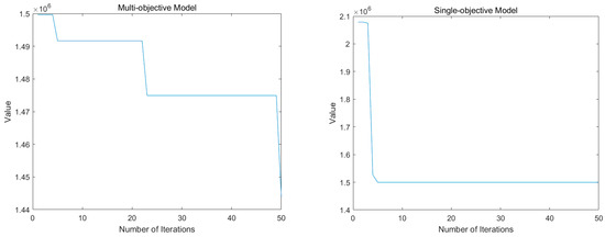 To further compare the differences in cost preference solution optimization between the multi-objective two-stage symmetry-based subway network planning model proposed in this paper and the single-objective two-stage model, we plotted the optimization convergence of cost preference solutions for the two models, as shown in Figure 9.