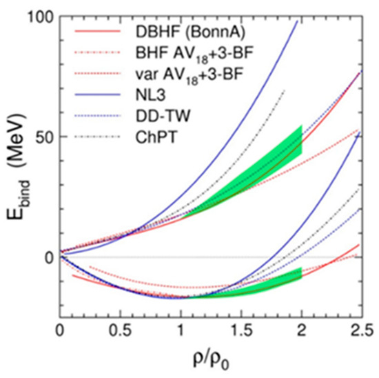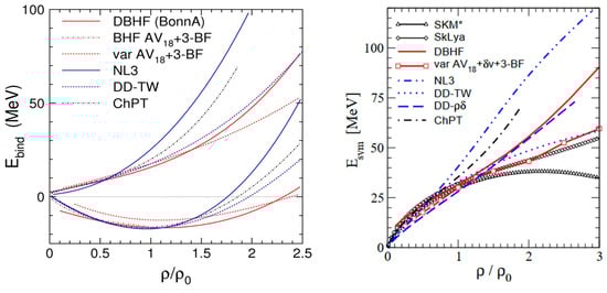 The left panel in Figure 1 depicts various calculations of the binding energy per nucleon for symmetric and antisymmetric nuclear matter as a function of density, whereas, in the right panel of Figure 1, the symmetry energy, i.e., the difference of the respective curves shown in the left panel, is plotted [16].