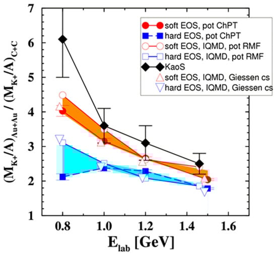 The data could be reproduced by microscopic Relativistic Quantum Molecular Dynamics (RQMD) calculations, taking into account in-medium kaon potentials calculated by the Chiral Perturbation Theory and assuming a nuclear incompressibility of Knm = 200 MeV [23]. The investigation of an excitation function allows to probe different densities. Moreover, the comparison to a light reference system partially cancels systematic background contributions to subthreshold kaon production from Fermi momenta and short-range correlations and reduces the effects of theoretical uncertainties concerning in-medium cross-sections and momentum-dependent interactions. Figure 2 depicts the experimental data together with the results of three different transport models assuming a “soft” EOS with a nuclear incompressibility of Knm = 200 MeV (red symbols) and a “hard” EOS with Knm = 380 MeV (blue symbols). The figure illustrates that the sensitivity of subthreshold particle production to the EOS increases with the decreasing beam energy, i.e., if subsequent particle interactions are required to accumulate the energy needed for the production of a kaon.