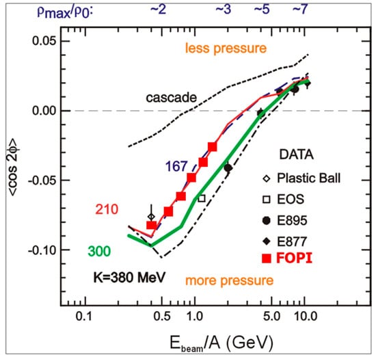 Elliptic flow as a function of the beam energy measured in heavy ion collisions (symbols) compared to the results of the relativistic transport model calculations for different values of the nuclear incompressibility [9]. The black symbols represent the results of the experiments at AGS (for details, see [9]). The FOPI/GSI results represented by red symbols [10] were included in the figure taken from [9]. The short-dashed black line (“cascade”) corresponds to calculations without EOS, and the long-dashed black line, the red line, the green line, and the dashed dotted line represent the results of calculations assuming nuclear incompressibilities of Knm = 167, 210, 300, and 380 MeV, respectively.