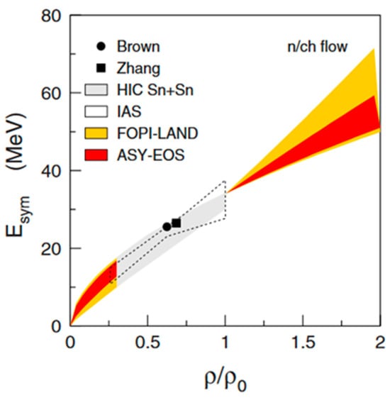 - Tsang, M.; Zhang, Y.; Danielewicz, P.; Famiano, M.; Li, Z.; Lynch, W.; Steiner, A. Constraints on the Density Dependence of the Symmetry Energy. Phys. Rev. Lett. 2009, 102, 122701. [Google Scholar] [CrossRef] [PubMed]