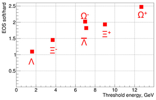 Ratios of (anti-)hyperon yields calculated with the PMQMD transport code for a soft over a hard EOS for central Au + Au collisions at a beam energy of 4 A GeV as a function of the production threshold in nucleon–nucleon collisions [32].