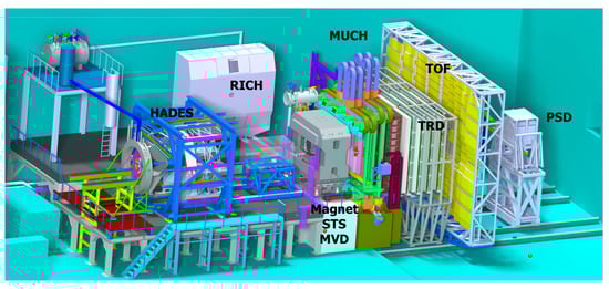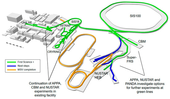 The working horse of the future, “Facility for Antiproton and Ion Research” (FAIR), is a synchrotron with a magnetic rigidity of 100 Tm (SIS100), which delivers proton beams up to kinetic energies of 29 GeV with intensities up to 3 × 1013/s, and heavy ion beams with kinetic energies from 2 A to 11 A GeV for Au or U nuclei with intensities up to 1010/s. The beams can be delivered to a superconducting fragment separator (SFRS), where rare isotope beams will be produced and transported to high-energy beam (HEB) experiments, which study the properties of these isotopes in order to explore the origin of heavy elements. The SIS100 beams will also be delivered to the cave of the CBM experiment, where the properties of dense baryonic matter will be investigated. The SFRS and the CBM experiment will be realized in the first stage of the FAIR project, as illustrated by the green lines in Figure 8. As the next step, as indicated by the blue lines in Figure 8, the experimental areas for the study of low-energy beams from the SFRS and the cave for the APPA (Atomic, Plasma Physics and Applications) experiments will be realized (applications include radiation biology and material science). FAIR will be completed by the construction of the collector ring (CR) and the high-energy storage ring (HESR), where hadron physics experiments will be performed with antiproton beams by the PANDA (AntiProton ANnihilation at DArmstadt) setup. The antiproton production target is located in a cave close to the APPA facility and will be bombarded by a high-intensity proton beam from a linear accelerator in front of the SIS18 synchrotron. These facilities are sketched by the brownish lines in Figure 8. The detailed FAIR research program was reviewed in [37].