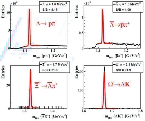 Invariant mass distribution of Λ, anti-Λ, Ξ+, and Ω− reconstructed from their daughter particles simulated for central Au + Au collisions at a beam energy of 11 A GeV [39].
