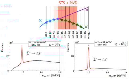 As discussed above, the measurements of the yields and spectra of Σ− and Σ+ hyperons in heavy ion collisions at different beam energies are expected to provide information on the symmetry energy at high densities. The identification of these hyperons represents an experimental challenge, as their decay lengths are only a few cm, and one of their two decay daughters is a neutral particle. Based on the configuration of the CBM tracking detectors in the magnetic field, the MVD, and the STS, simulations using microscopic transport codes have been performed in order to reconstruct the hyperons by measuring only the hyperon track and the track of the charged decay daughter. The tracks are illustrated in the upper picture of Figure 11 for the case of a Σ− hyperon decaying into a π− and a neutron. Based on the missing mass hypothesis, the invariant masses of the Σ+ and the Σ− hyperons could be reconstructed, as shown in the lower pictures of Figure 11.