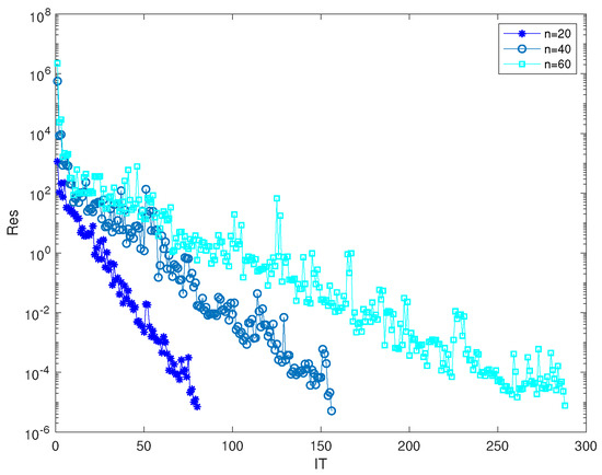 Applying for Algorithm 1, the IT is 46, the CPU time is 3.9496 s and the Res is . Figure 1 illustrates that Algorithm 1 is feasible.