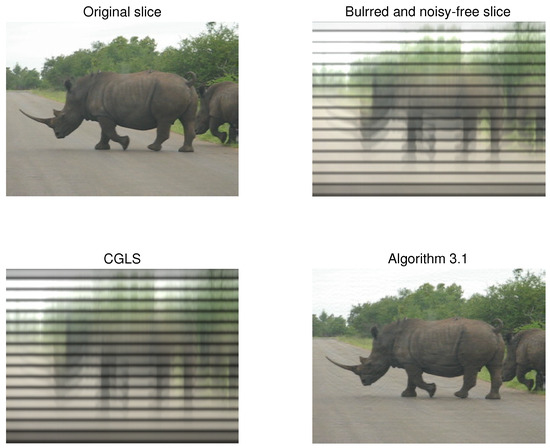 We employ Algorithm 1 to compare its performance with the CGLS algorithm in restoring a color video comprising a sequence of RGB images (slices). The video, titled ‘Rhinos,’ originates from Matlab and is saved in AVI format. Each frontal slice of this color video is represented by a pure quaternion matrix with dimensions of pixels. For , we consider to represent the orginal colour video, A as the blurred matrix, and as a noise tensor. When , is referred to as the blurred and noise-free color video. In this scenario, we select a blurred matrix , where and are Toeplitz matrices with entries defined as follows: