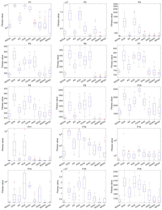 Boxplots of the MOOA and other algorithms on CEC2017 (F1, F3–F16).