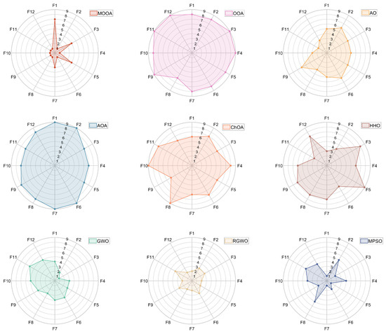 Radar plots of the MOOA and other algorithms on CEC2017.