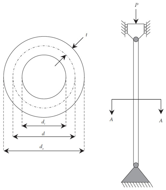 The objective of the tubular column design problem is to minimize the cost while withstanding the compression loads of P [46]. Figure 13 illustrates the structure of a uniform tubular column and its cross-section. Two variables need to be determined: the average column diameter (d) and the tube thickness (t). In this issue, the length of column l is 250 cm. The modulus of elasticity E is , and the yield stress is . The mathematical model of this problem is given in Equation (19).