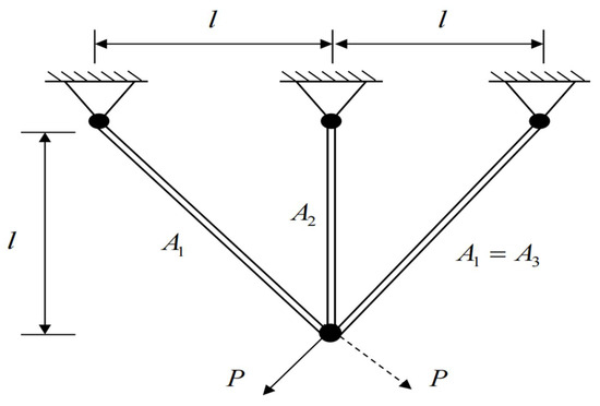 The goal of the three-bar truss design problem is to obtain the minimum weight of the three-bar truss structure [47]. As shown in Figure 14, two variables are required to be optimized: the cross-sectional regions and . The formulas are described in Equation (20).