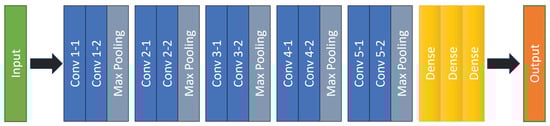 Transfer learning is a technical method in machine learning that realigns Convolutional Neural Networks (CNNs) initially trained for one task, to serve as a foundation for a model designed for a different task []. It enables the utilization of pre-existing, high-quality models that have been trained on extensive datasets. The primary benefit of transfer learning is its ability to apply the knowledge acquired from solving a similar problem, rather than initiating the learning process from zero. As a result, transfer learning capitalizes on prior learning, eliminating the need to start a new learning process from scratch []. This method has been employed in various classification problems, yielding satisfactory outcomes in terms of both training duration and accuracy. Transfer learning is typically implemented through the use of pretrained models. These are models that have been previously trained to address a problem similar to the one we aim to solve, using a comprehensive benchmark dataset [,]. In this study, the VGG16 model is used for the transfer learning task, and its architecture is provided in Figure 1.