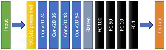 A pretrained model VGG16 model is used in this study, and its architecture can be seen in Figure 1. A base VGG16 is kept by removing its last four layers. The output of VGG16 was connected to convolution layers consisting of 24, 36, 48, and 64 units, respectively. Then, a flattening layer was added, and last, it was followed by fully connected layers consisting of 100, 50, 10, and 1 units. Each fully connected layer contains a dropout layer along with itself for a better generalization of the model by preventing overfitting. Our model’s architecture can be seen in Figure 4.