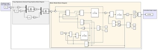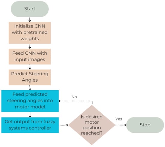 In our study, we employ a Convolutional Neural Network (CNN) model, denoted as , and a fuzzy system controller, denoted as (G), to predict and control the steering angle in the context of electric power steering (EPS) systems. The flowchart of the algorithm for the complete system is given in Figure 5. Different colors are used to differentiate the parts corresponding to CNN-based prediction and fuzzy systems-based control.