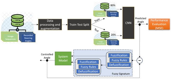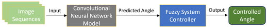 The process of experimentation in this study involves data processing and augmentation, train–test splits, model building and adjusting, performance evaluation, and designing the fuzzy signatures-enhanced fuzzy system controller. Firstly, data are processed, and augmentation steps consisting of horizontal flip, random brightness, and zooming are applied in order to increase the amount of samples in the dataset. Then, the pretrained model VGG16 is selected for transfer learning, and as a first step of the model building, the model input size is defined according to the image size. Then, the dataset is split into training and test datasets. The chosen pretrained model is used to extract the features from the training dataset. After feature extraction, the model is trained on the training dataset using the extracted features. The algorithm used for steering angle prediction and control, depicted in Figure 5, is applied next. The model’s performance is then validated on the test dataset with the MSE score serving as the evaluation metric. Finally, the trained model is used to predict steering angles.