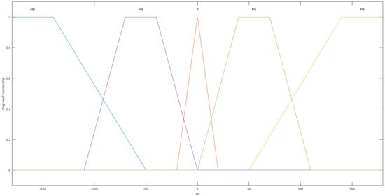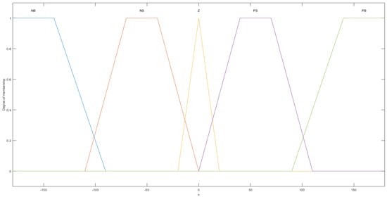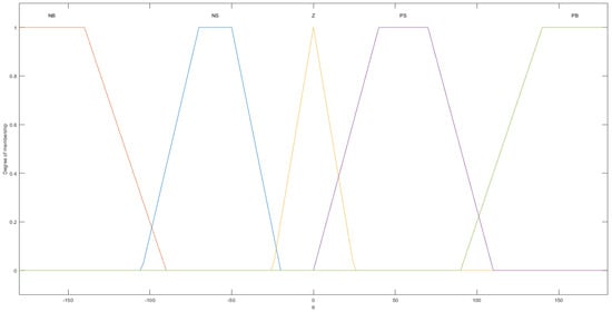 In this study, during the fuzzification process, the membership functions are scaled within the range [− because, in our experience, the values fall in this range for controlling the motor’s position. It could also be possible to perform this by adding additional gains, but this approach was preferred due to its convenience. The membership functions that we developed for the input and output variables in our fuzzy system controller are depicted in Figure 8, Figure 9 and Figure 10. This representation offers a clear understanding of the membership degree for each variable, providing significant insights into the operational dynamics of our fuzzy controller.