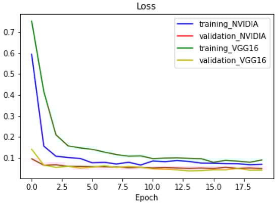 The training loss quantifies the model’s performance on the training dataset, while the validation loss provides an assessment of the model’s ability to handle data it has not been trained on, which gives an estimation of how the model will perform on unseen data. According to Figure 15, it can be seen that the NVIDIA model’s training loss is lower than the proposed model and therefore NVIDIA model learned the training data better. However, lower validation loss for the proposed model shows that it is better at making predictions on unseen data, which is ultimately what is cared about in deep learning models. Hence, it can be said that the proposed model’s generalization ability is much better than the NVIDIA model.
