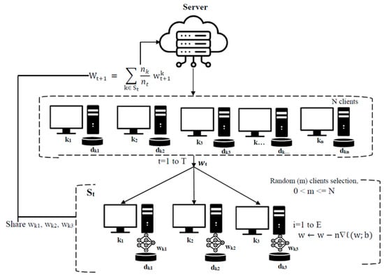 The FedAvg algorithm was developed by [23]. It randomly generates an initial ML model’s parameters () for uploading it to a randomly selected set of clients (St), which is defined as the number of clients with m = N.C; where m is the selected small set of clients, N is number of all clients, and C is the fraction of selected clients for local model updates, for example, where N = 100 clients and C = 0.1, m = 100 × 0.1 = 10 clients for working in each communication round (t = 1 to T). Each client in St will locally update the current global model () in the current communication round with the local dataset () which is split into batches of size B by the Stochastic gradient descent (SGD) technique. In local epochs (i = 1 to E), SGD proceeds to adjust the local models’ old weights () by subtracting the calculated gradient values to be the new weights (). The gradient values are defined by calculating the local loss value () on batch data () made with client’s local model () multiplied by the learning rate () for adjusting local models’ parameters in each local epoch. Then, the updated local models () in St are sent to be aggregated in the global model () on the server. The insight of the FedAvg concept is shown in Figure 1 and Algorithm 1.