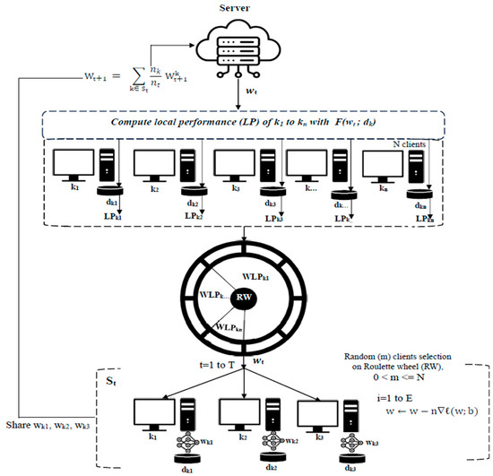 The proposed Fed-RHLP uses roulette wheel selection by incorporating biased values from measured local model performance to select a set of clients with high local performance for updating and aggregating the global model in each communication round. The roulette wheel selection probabilistically chooses clients from a set of all clients based on their fitness values [24]. The process involves computing fitness probabilities by normalizing individual fitness, creating a virtual roulette wheel corresponding to each client’s fitness, and randomly selecting individuals by spinning the wheel. This approach balances favoring higher fitness clients while still giving less fit clients a chance of being selected for local model updates and global model aggregation, thereby increasing a variety of clients’ data points used in processing for the next generation [25,26].