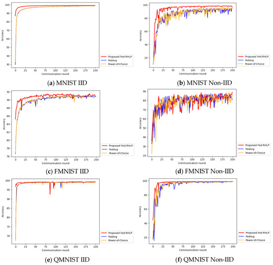 To evaluate the accuracy of Fed-RHLP, we compare the global model’s accuracy with two baseline algorithms on MNIST, FMNIST, QMNIST, and CIFAR datasets under both IID and Non-IID scenarios. The results are shown in Figure 4a–h.