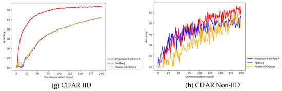 From Figure 4a–h, it can be seen that Fed-RHLP achieves faster convergence speed and gives a more accurate global model than Fed-Avg and Power-of-Choice in testing on MNIST, FMNIST, QMNIST, and CIFAR IID and Non-IID.