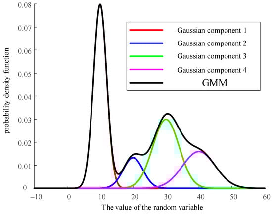 GMM describes the joint probability distribution of a random vector x, represented as the convex sum of several Gaussian distributions []. The set of adjustable parameters for GMM is denoted by Ω = {ωm, μm, σm; m = 1, 2, …, M}. The formula for GMM is outlined below: