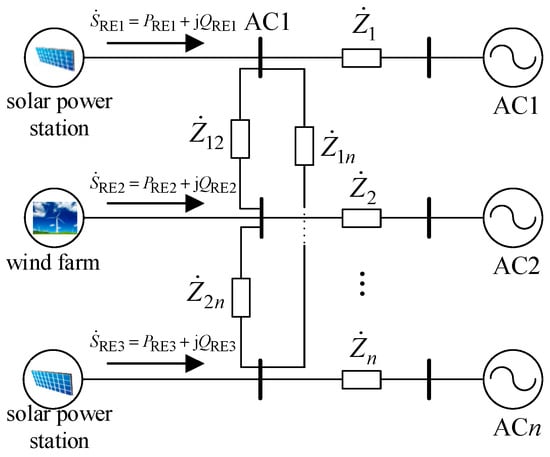For a long time, short-circuit ratio, as a static analysis method, has provided an important reference for the planning and operation of power grids due to its simplicity and intuition. The multi-site short-circuit ratio for renewable energy, as suggested in the referenced literature [], presents a more comprehensive MRSCR calculation formula that removes all assumptions inherent in the traditional CIGRE short-circuit ratio derivation. This approach accounts for both amplitude and phase differences among electrical quantities across various nodes. It also considers the impact of reactive power from renewable energy generation equipment, making it applicable for evaluating and calculating voltage strength in diverse scenarios of multi-renewable energy site access systems. Figure 2 shows the simplified equivalent model of i (i = 1, 2, …, n) renewable energy stations simultaneously connected to the AC system.