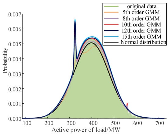 In this paper, the 5th-order Gaussian mixture model, the 8th-order Gaussian mixture model, the 10th-order Gaussian mixture model, the 12th-order Gaussian mixture model, the 15th-order Gaussian mixture model, and the normal distribution are selected to fit the probability density curves of the load measured data, respectively. The selection of these specific model orders is based on a balance between model accuracy and computational efficiency. The 5th-order model was chosen as it provides a simple yet reasonably accurate fit, capturing the basic structure of the data. The 8th-order model was introduced to improve upon the 5th-order, addressing some of the complexities in the data that the lower-order model might miss. The 10th-order model, identified through preliminary analysis, was expected to provide the best overall fit, balancing accuracy and computational demands. The 12th-order model was added to examine the effects of a slight increase in model complexity beyond the 10th-order, though it introduces some risk of overfitting, particularly evident in its slight overestimation of the highest peak. Finally, the 15th-order model was included to explore the impact of higher complexity on the model’s accuracy and computational cost. These selections allow for a comprehensive comparison of the fitting effects, providing insights into the trade-offs between model complexity, accuracy, and computational efficiency.