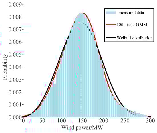 Based on the analysis above, given the satisfactory fitting performance of the 10th-order Gaussian mixture model, the probability model for wind power output is also adopted as a 10th-order Gaussian mixture model. A probability model of the GMM is established using actual output power data from a wind farm.
