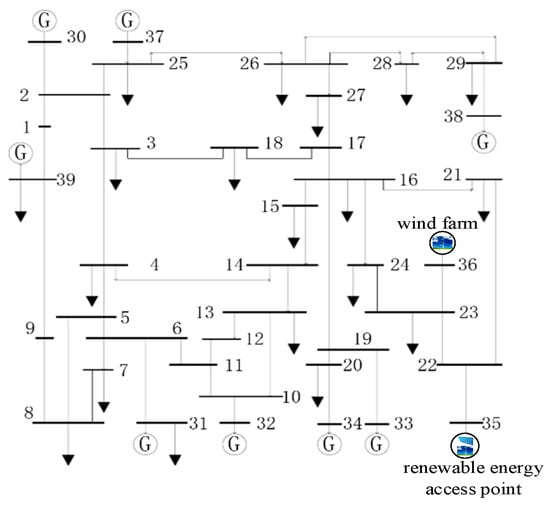 To validate the effectiveness of the proposed methodology, we applied the Metropolis–Hastings (M-H) algorithm to a modified IEEE 39-bus system to evaluate its ability to integrate renewable energy sources. The method’s accuracy was subsequently corroborated using Monte Carlo simulation (MCS) as a benchmark. Additionally, Gibbs sampling was employed to provide a further comparison and validation of the results. In this simulation, the active and reactive power at nodes 21 and 23 followed Gaussian mixture distributions, derived from actual load data measurements. Moreover, the conventional generator at node 36 was replaced by a wind farm, with the farm’s output modeled as a random variable also adhering to a Gaussian mixture distribution. To further analyze the impact of stochastic variations in load and wind on the system’s capacity to accommodate renewable energy, node 35 was designated as a renewable energy access point with a power factor of 0.94, and the capacity for renewable energy was incrementally increased by 2 MW in each calculation iteration. The modified IEEE 39-bus system is shown in Figure 6.