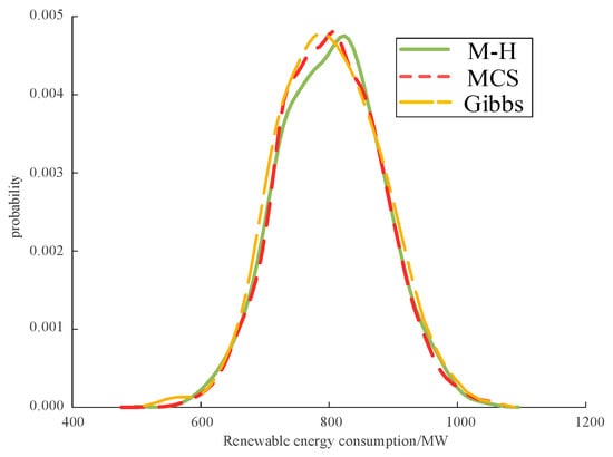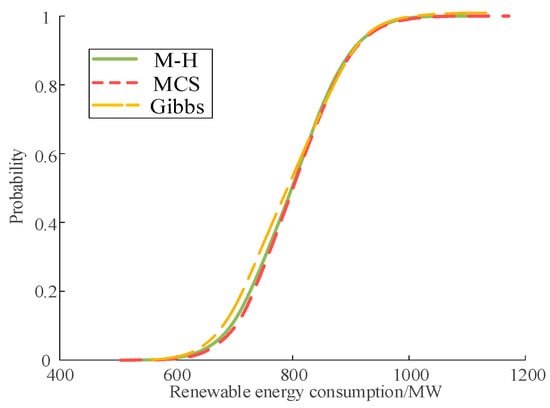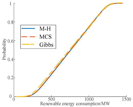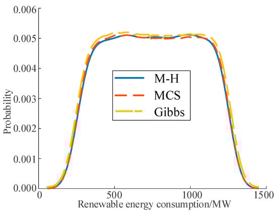 As shown in Figure 7 and Figure 8, the probability density curves generated by the Metropolis–Hastings (M-H) algorithm, the Monte Carlo simulation (MCS) method, and the Gibbs sampling method are nearly identical, indicating that all three methods provide a consistent and accurate assessment of the fluctuations in renewable energy consumption in response to changes in load and wind power. This comparison highlights the reliability of the M-H algorithm, which was validated against the well-established MCS method and further corroborated by the Gibbs sampling approach. Table 3 presents the probabilistic statistical indicators of renewable energy consumption obtained from all three assessment methods, further confirming the accuracy and consistency of the M-H algorithm in evaluating renewable energy integration.