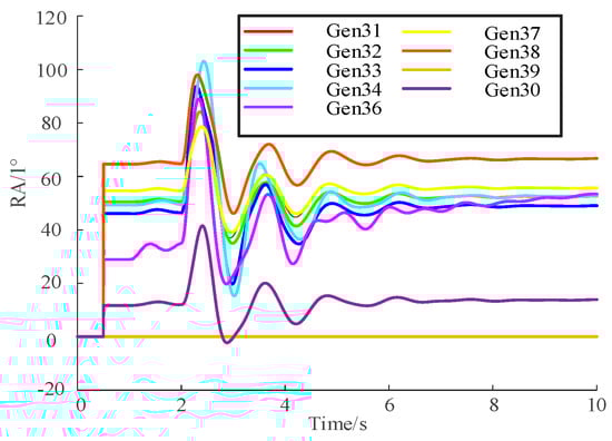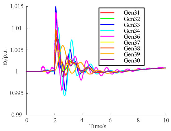 In order to assess the security and robustness of the power system under maximum renewable energy access conditions, an N-1 fault validation is necessary. This process simulates the power system’s ability to respond and adjust in the event of failure of any single component (e.g., substation, transmission line, etc.) to ensure that the stability of the power system is not affected by a single point of failure. Under the maximum renewable energy access capacity, this paper simulates an N-1 fault on lines 4–14 in the IEEE 39-bus system, whose fault type is a three-phase ground fault with a fault onset time of 2 s. After the fault, the changes in each generator parameter are shown in Figure 9, Figure 10 and Figure 11.