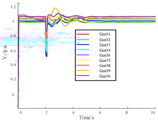 After the N-1 fault simulation of the modified IEEE 39-bus system, the analysis of the three parameter variation plots shows that the response of each generator in the system exhibits significant transient fluctuations after the occurrence of a three-phase ground fault. Firstly, Figure 9 demonstrates that the rotational speed undergoes a brief overshoot and then stabilizes after the fault, which reflects that the generators have sufficient inertia and regulation to resist the transient perturbations. Figure 10 shows that the generators’ power angle differences increase significantly during the initial phase of the fault, posing a brief challenge to system stability, but gradually return to a more stable state after the fault is cleared. Figure 11 shows that the voltages of all generators show a sharp drop, followed by a gradual recovery of the voltage to a level close to the pre-fault level. It shows that the system has the ability to cope with N-1 faults and maintain stable operation under the calculated maximum carrying capacity of the renewable energy source.