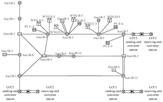 Symmetry in renewable energy integration refers to the balanced incorporation of renewable sources like wind and solar into the power grid, emphasizing equilibrium between variable supply and consistent demand to ensure stability. Lately, sources of renewable energy, including wind and solar, known for their lack of carbon emissions, have swiftly become part of the electrical grid [,]. They have occupied an important position in the energy systems of many countries. As of 2021’s close, the worldwide installed capacity for solar and wind energy reached 1674 GW, with European nations like Germany, Denmark, Norway, and Sweden extensively adopting these green energy solutions [,,]. However, the generation of renewable energy typically exhibits strong randomness, intermittency, and volatility []. The integration of a high proportion of renewable energy complicates the operational characteristics of power systems. Characteristics such as low disturbance rejection, low inertia, and low short-circuit capacity inherent in power systems will pose significant challenges to their balance capacity, support capacity, regulation ability, and safety and stability [,,]. Stability, in this context, is vital because it ensures that the grid can reliably accommodate fluctuations in energy supply and demand without compromising the continuous delivery of electricity or the security of the power network. Hence, to lower the renewable energy reduction rate and guarantee the system’s safe functioning, it is critically important to precisely evaluate the system’s capacity to absorb renewable energy.