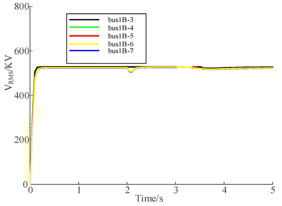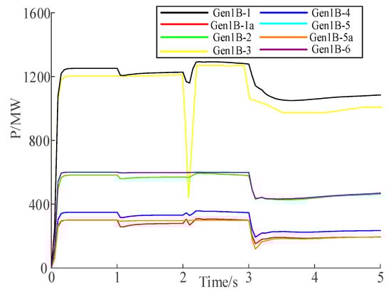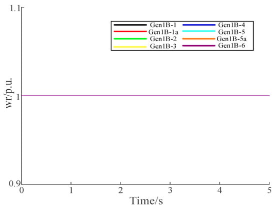 Similarly, under the maximum renewable energy access capacity, this paper simulates an N-1 fault on bus 1B-8 in the AC–DC hybrid system shown in Figure 12. The fault type is a three-phase ground fault with a fault onset time of 2 s. After the fault, the changes in bus voltages, generator active power, and generator speed are shown in Figure 15, Figure 16 and Figure 17. After the N-1 fault simulation of the AC–DC hybrid system, Figure 15 shows that the bus voltage fluctuates transiently when the fault occurs, which is manifested as an instantaneous drop, and then gradually recovers and tends to stabilize, and recovers to a level close to the pre-fault level, which indicates that the system has a good voltage recovery capability and steady-state performance; Figure 16 shows that the active power of each generator fluctuates to varying degrees at the time of the fault occurrence, especially that some of the generators (e.g., Gen1B-4 and Gen1B-6) showed a significant drop in active power and then a rapid recovery, after the fault is cleared, the active power of the generators gradually recovers and tends to a new steady state, which indicates that the system is able to re-distribute the power load after the fault and gradually return to a steady state; Figure 17 shows that the generator speed remains basically unchanged before and after the fault, showing a horizontal straight line, which indicates that the generator speed is not significantly affected in the simulation of the N-1 fault, indicating that the system has strong inertia and regulation ability, and is able to effectively resist the transient shocks caused by the fault, and maintain the stable operation of the generator. In summary, the simulation results show that the AC–DC hybrid system exhibits good voltage recovery capability, power load redistribution capability, and generator stability under N-1 fault, which verifies the safety and robustness of the system under the maximum renewable energy access capacity.
