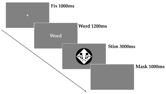Before the main experiment, there was a training block containing 20 stimuli (5 stimuli of each category), aiming to familiarize the participants with the experimental process. The stimulus materials in the training block did not appear in the formal experiment. Only when the accuracy rate of the training block was greater than 80% were the participants allowed to enter the formal experiment. The main experiment consisted of a total of 300 trials, including 75 balanced, 75 imbalanced, 75 beautiful, and 75 not beautiful trials. The main experiment was divided into three blocks, each with 100 trials, and there was at least a 5 min break between each block. Each trial began with a stationary white cross at the center of the screen, displayed on a gray background for 1000 ms. Subsequently, a cue word (beauty, balance) for the judgment task was presented for 1200 ms. After that, a stimulus image appeared for 3000 ms, during which the participants were required to make a judgment and press the button as promptly as possible. Finally, a blank stimulus lasting for 1000 ms appeared, and the participants could blink and rest during this stage, as shown in Figure 5. The entire experiment took approximately 1.5–2 h, including the preparation stage before the experiment. The experiment was conducted in a standard lightbox, as shown in Figure 6.