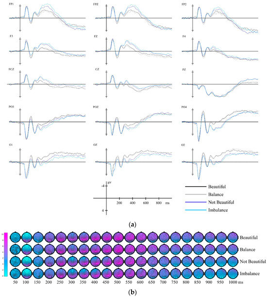 ERP data revealed that in the early stage (300–500 ms), ERP data showed significant separation between tasks, and the aesthetic task activated more extensive and active brain region activities than the balance task. At the same time, significant separation also occurred in the answers, and beautiful and balanced materials activated more active brain region activities in this time window. Specific analysis showed that unbeautiful and imbalanced materials activated significant ERP components in different brain regions: unbeautiful and imbalanced materials activated larger-amplitude negative waves in the prefrontal to central regions and larger-amplitude positive waves in the parietal–occipital and occipital regions. In the late stage (600–1000 ms), ERP data showed significant separation in the answers, specifically on the PZ channel, where beautiful materials activated a larger-amplitude sustained posterior negativity (SPN).