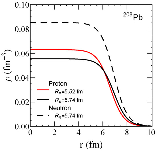where represents the distribution of either protons or neutrons. When the densities of protons and neutrons are the same, the value of and are fm, calculated with the first kind of proton density. The neutron skin of the nucleus is expected to be around 0.2 fm. Therefore, the parameters of the second proton density are taken to be fm. The two types of proton densities and the neutron density are depicted in Figure 1. In the scenario without a neutron skin, where protons and neutrons are uniformly distributed within the nucleus, the root-mean-square radius of protons (and neutrons) is fm, as shown in Figure 1.