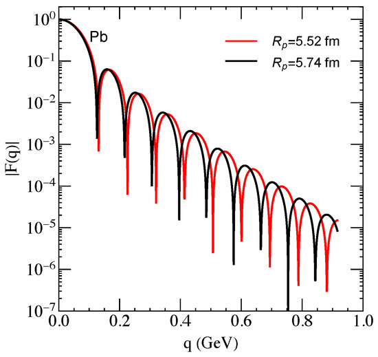 The form factors of the nucleus Pb as a function of the momentum q. Two kinds of proton distributions are taken to calculate the form factors. The radii characterizing the proton distribution are taken as fm and fm, respectively.