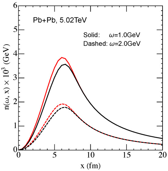 The densities of quasi-real photons as a function of the distance x in Pb+Pb collisions at the energy TeV. Solid and dashed lines represent the photon spatial distribution with the energy and 2 GeV, respectively. Red and black lines correspond to the case with the root-mean-square radius of the proton distribution of and 5.74 fm, respectively.