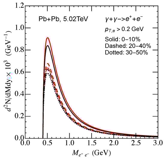 where and are the distance between the scattering position of two photons and the center of nuclei 1 and 2, respectively. b is the impact parameter of two colliding nuclei. is the photon density given by Equation (5). The dilepton production cross-section in the reaction is given by the Breit–Wheeler formula [59],
