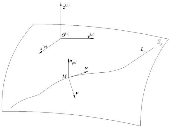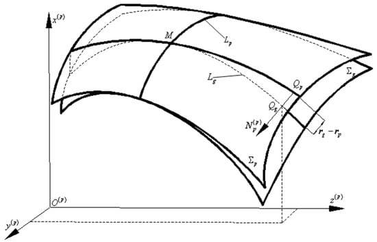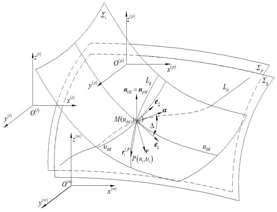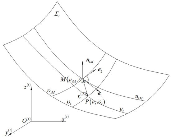 where, is the position vector function of any point P on the tool surface in the tool coordinate system ; is the vector function of the unit normal vector at any point P on the surface , which is any point on the surface other than point M, as shown in Figure 3.