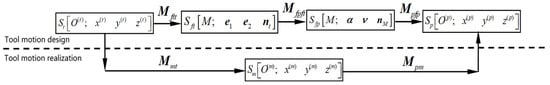 From Figure 3, the coordinate transformation path from the surface to surface is shown as the path above the dotted line in Figure 4, and the significance of the kinematic transformation chi-squared matrices , and in Figure 4, which are completely described by the invariant parameters of the surface motion of the tool surface and the design surface along the tool contact point trajectory , and the motion of the tool with respect to the workpiece during the development of the surface has been designed using the method of embedded differential geometry based on the surface moving frame . In this way of describing the motion, is completely determined by the differential geometry of the surface and the design surface . The transformation matrix from the surface to the design surface is shown in Figure 3 and Figure 4. As can be seen in Figure 3 and Figure 4, the transformation matrix from surface to design surface is