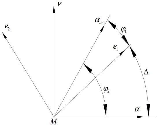 For graphical convenience, it is assumed that the tool surface envelope , shown in Figure 6, has been selected from the family of envelope surfaces shown in Equation (17), which must be tangent to the design surface along the tool contact point trajectory curve , and that the short-range deflection and normal curvature of the two surfaces are equal at each point on the curve in each direction. is the envelope eigenline of over any point M on , and is an arbitrary point on it through which a plumb line of surface intersects surface at . Then the deviation of surface from surface at is