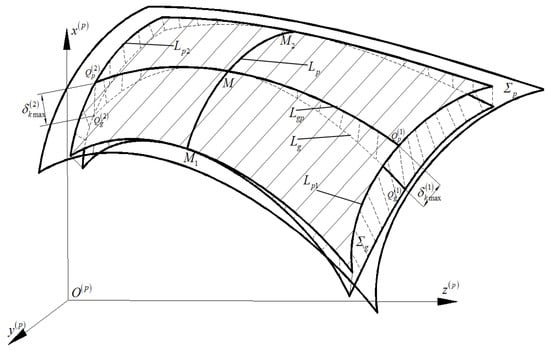 From Equation (17), when the tool surface moves relative to the design surface according to the motion described in Equations (7) and (8), the enveloping surface is a family of surfaces with () as the curvilinear coordinate parameter, and all surfaces in this family of surfaces are tangent to the design surface along the tool contact point trajectory curve , and the short-range deflection and normal curvature of the two surfaces are equal at any point on the curve in any direction; In the surface area beyond the tool contact point trajectory, the surface in the surface, family has a different error from the design surface . In Equation (17), the parameters and are the curvilinear coordinates of the surface , and and are the variable parameters that form the surface family. Therefore, it is possible to determine the motion-invariant parameters and by further optimizing the tool motion (7) and (8) with respect to the workpiece, i.e., by determining the conjugate curve of the tool contact point trajectory on the tool surface under the envelope motion , in order to achieve a global minimum of the error of the tool envelope surface with respect to the design surface in a wide range of regions other than the tool contact point trajectory curve ; From this family of surfaces, a surface that minimizes the error with the design surface is selected as the envelope of the tool surface (the actual machining surface). In the following, we describe the method of estimating the error between the envelope surface and the design surface in the theory of envelope−approximation, which serves as the theoretical basis for the practical application of machining.