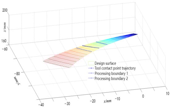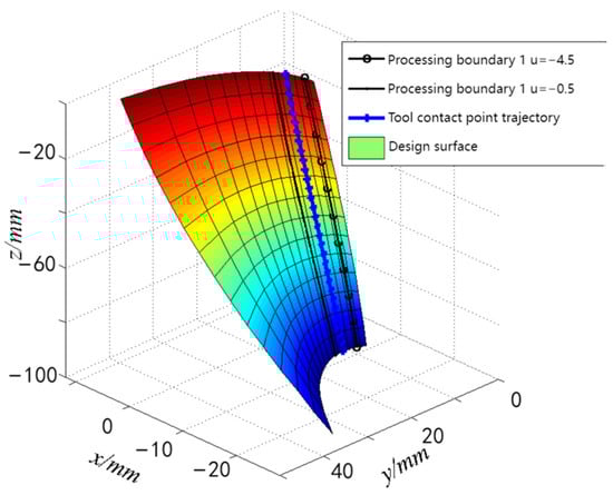 The constraint in Equation (30) ensures that the surface approaches the design surface from outside the design surface to avoid overcutting. The and in Equation (29) are the arc length coordinates of the boundary curves and , respectively.