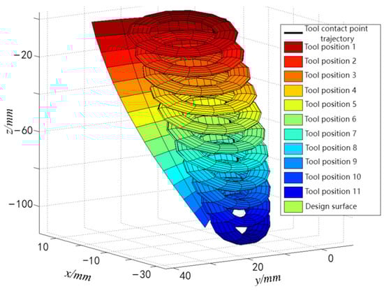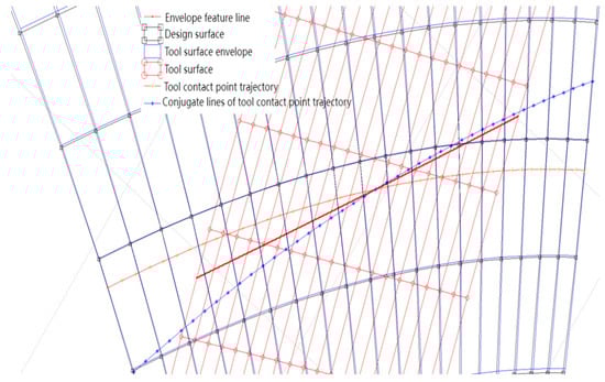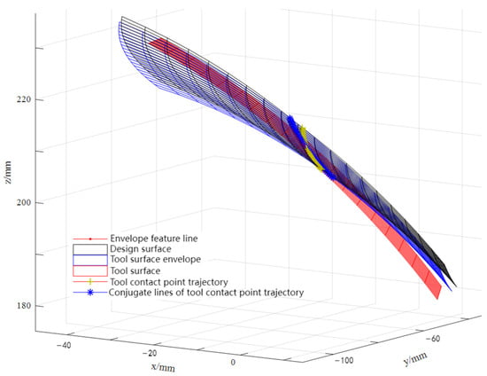 From Equations (10)–(15), we can find , . Substituting them into Equation (16), can be expressed as a function of the embedded parameters when the parameters to be determined in the tool surface envelope motion equation from Equations (5)–(8) satisfy Equations (10)–(16), the tool envelope is tangent to the design surface along the curve , and the short-range deflection and normal curvature of both are equal to each point of the curve in any direction.