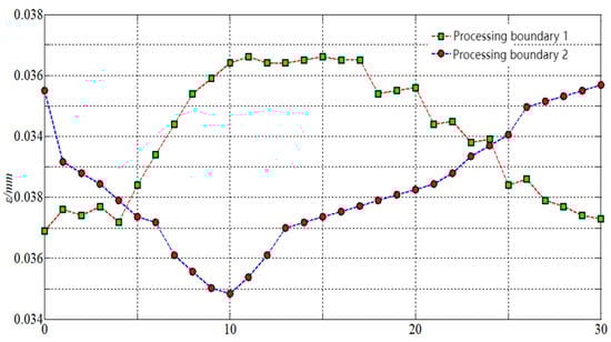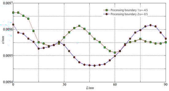 In order to verify the machining accuracy and efficiency of the method in this paper, firstly, according to the type 1 optimization model (i.e., with the maximum line width as the optimization objective), the maximum machining line widths are calculated when the given machining error is = 0.005 mm and = 0.01 mm, respectively, and compared with the existing machining methods. The calculation results show that the maximum width of the line width is 6.63 mm when the tool contact point is located at the curvilinear coordinates (2, 0.376) of the helical surface to be machined and the direction of the tool axis in the coordinate system of the surface to be machined is (0.9374, 0.2811, −0.2057) with a machining error of = 0.01 mm. In the case of a machining error of = 0.005 mm, the maximum width of the line width is 5.87 mm when the tool contact point is located at the curvilinear coordinates of the helical surface to be machined (2, 0.563), and the direction of the tool axis in the coordinate system of the surface to be machined is (0.8968, 0.3301, −0.245). Then, according to the type 2 optimization model (i.e., the optimization objective is to minimize the machining error), a machining area with a line width of 6.07 mm is selected on both sides of the tool contact point trajectory, the machining area boundaries are set (the curves of = −0.5 and = −4.5 shown in Figure 14), and the deviations of the tool envelope from the design surface are calculated along the machining area boundaries for the tool contact points. Figure 16 shows the variation in the deviation of the tool envelope from the design surface at each point along the two boundaries.